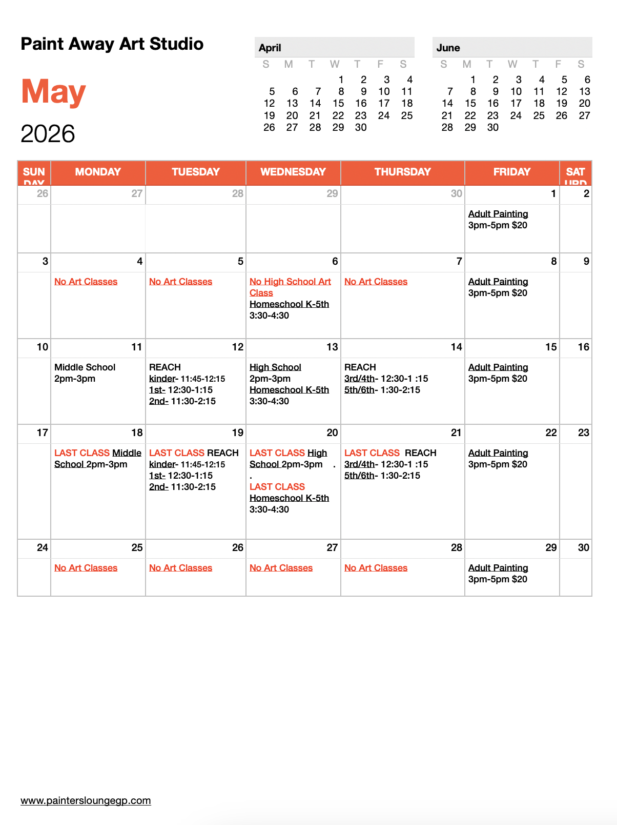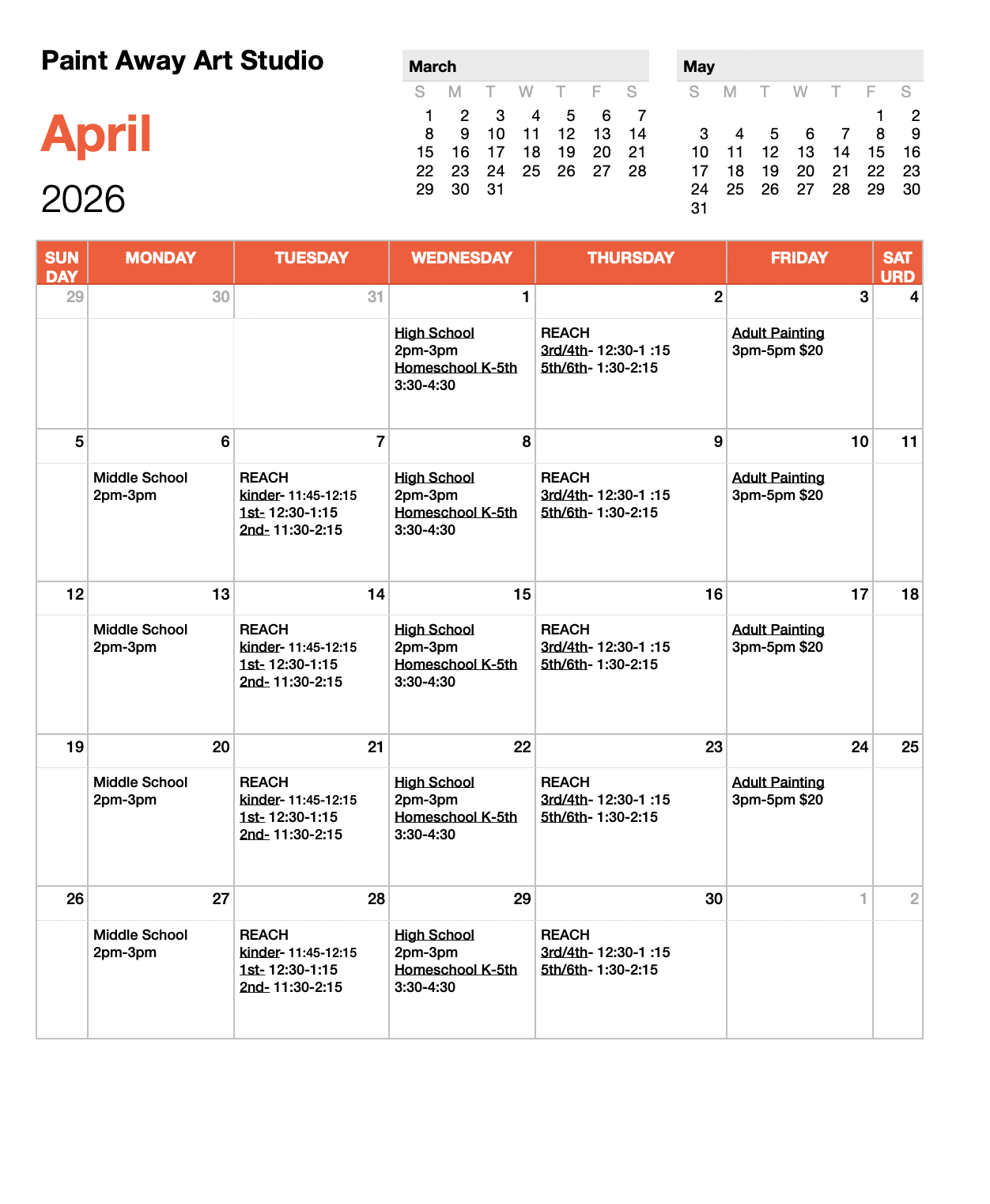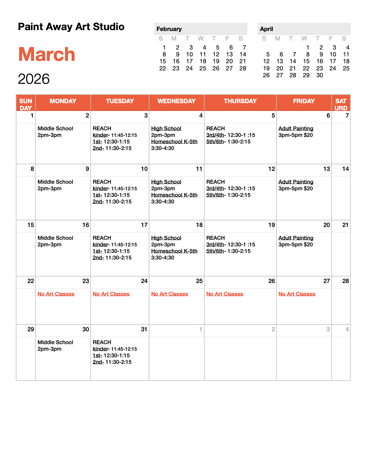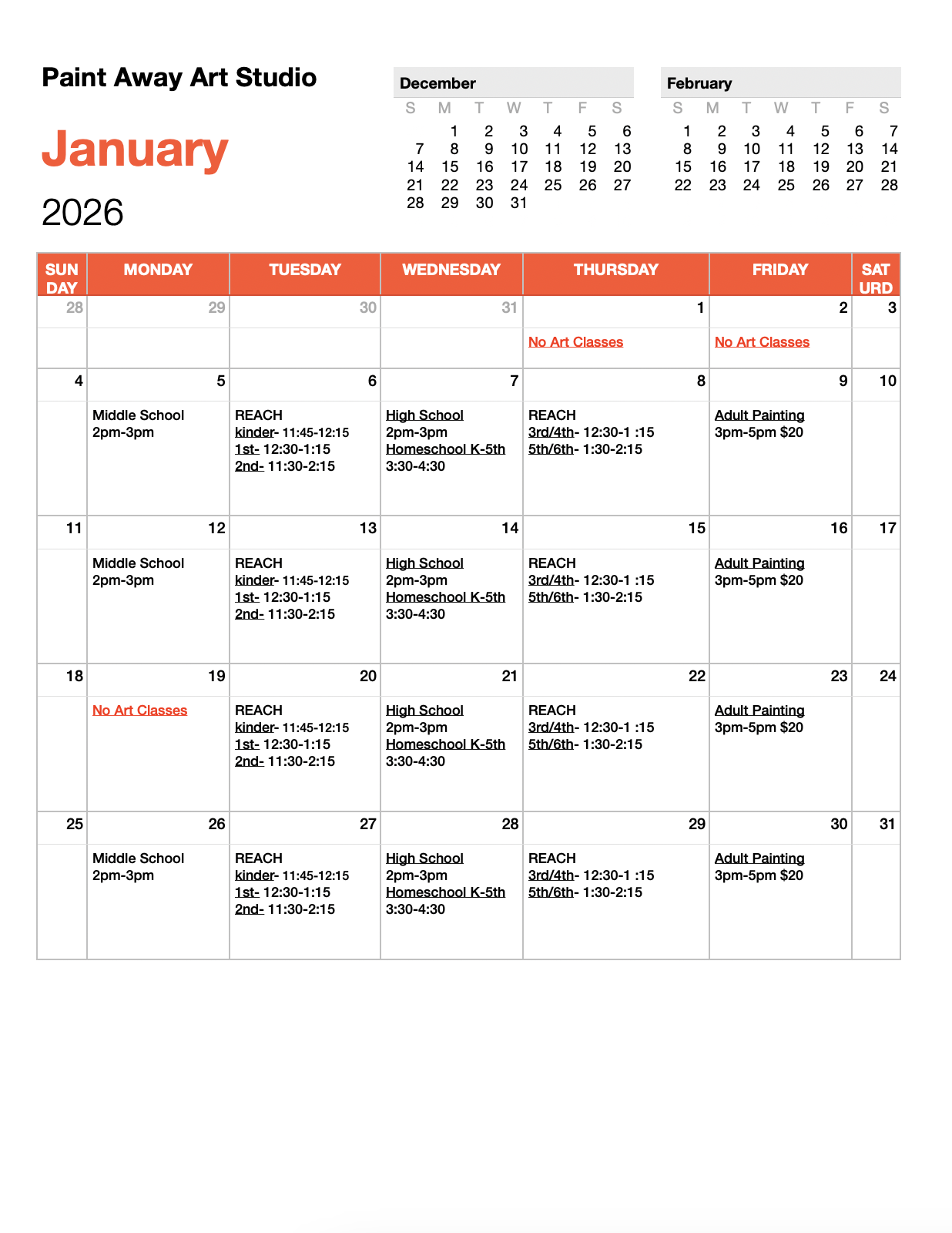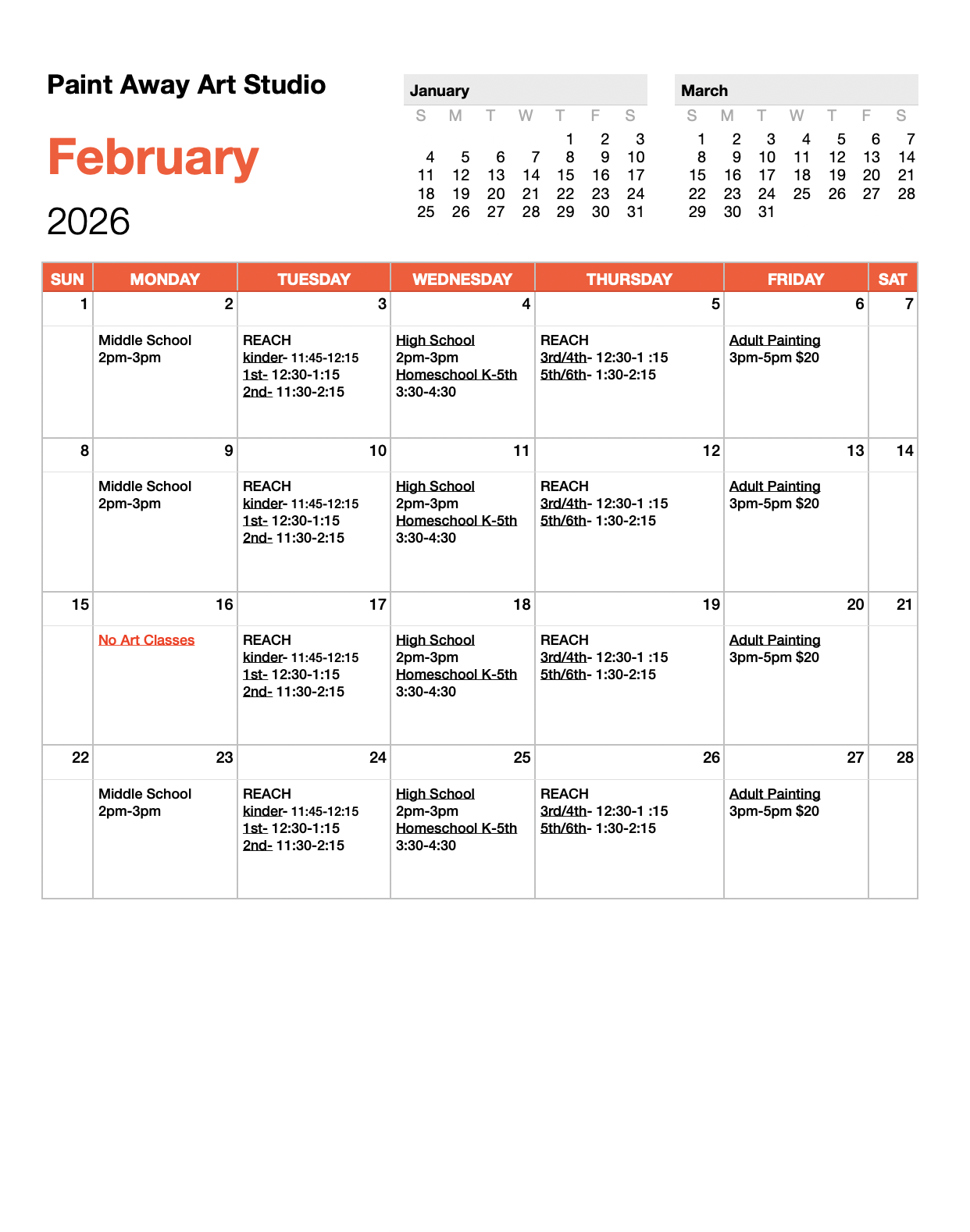 Age Groups: Kids Art (K-5th) Wednesdays 3:30-4:30, Middle School Art (6th-8th) Mondays 2-3pm High School Art (9th -12th) Wednesdays 2-3pm , Adult Painting - Fridays 3pm-5pm