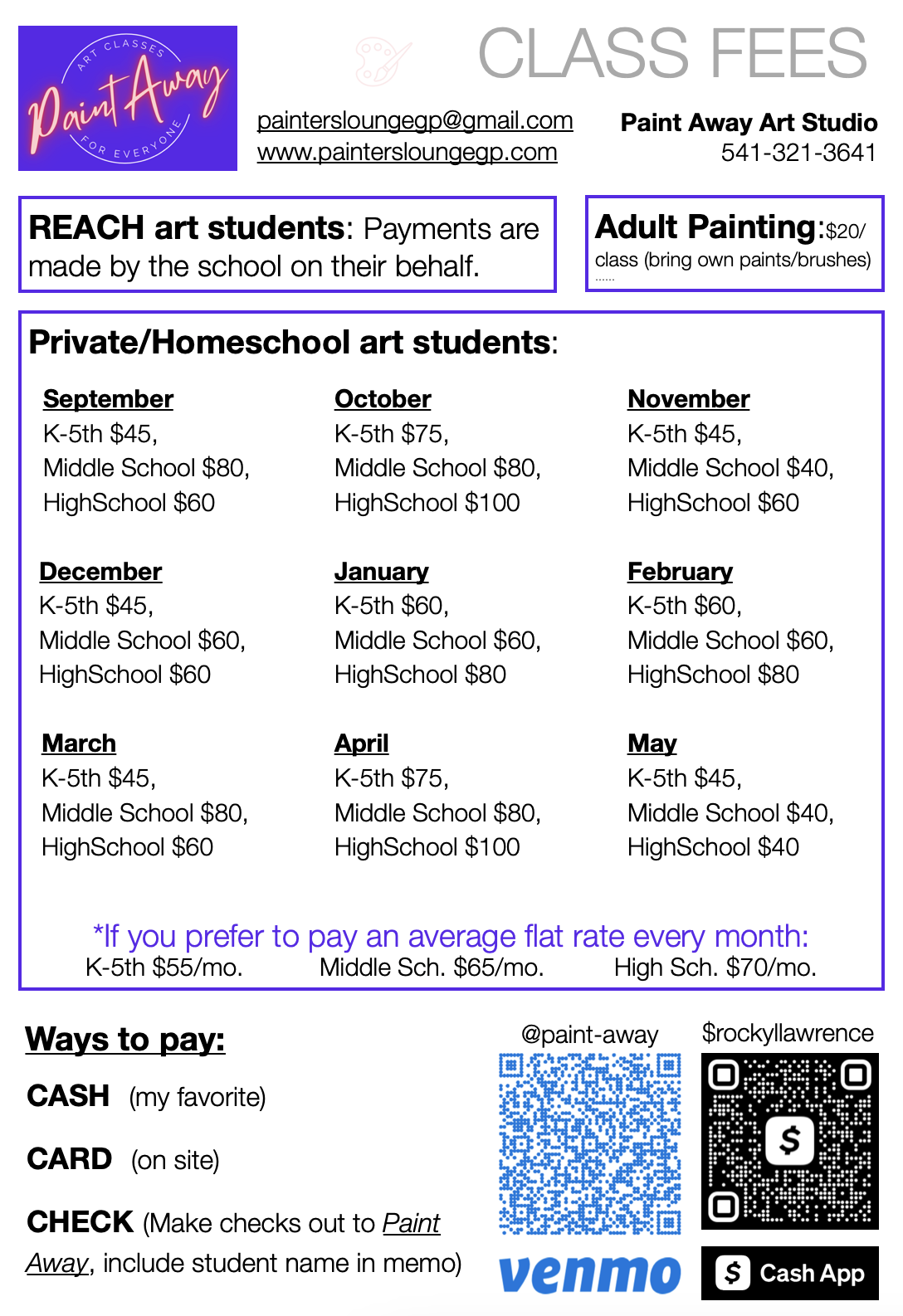 💳 Pay with cash, card, cashapp or Venmo on the first day. (Venmo QR code is at the bottom of the page).